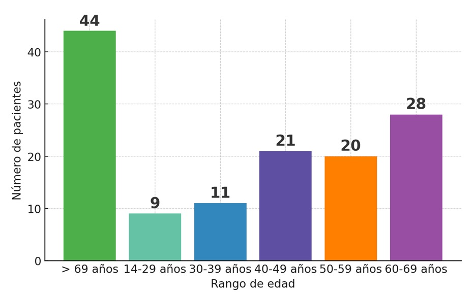 La población de sexo masculino fue predominante en un 63 % de los pacientes, y en la Gráfica 1 se observa un grupo de edad mayor a 69 años donde se presentó con mayor frecuencia en un 33 %. Estos datos se asemejan a los ya encontrados en la literatura nacional, donde reportan el predominio de esta patología en el sexo masculino y grupos de edad de entre 51 a 75 años5,9.