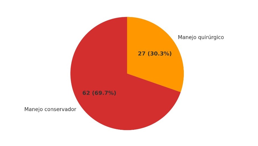 Al observar la Gráfica 2, la cual se circunscribe a pacientes con obstrucción intestinal parcial, observamos un 70 % de pacientes que respondieron a manejo conservador vs. 30% que requirieron un manejo quirúrgico. De igual forma, nuestra estadística es similar a la presentada a nivel internacional22,19 en cuanto al éxito del manejo conservador en obstrucción intestinal parcial; sin embargo, contrario a lo presentado a nivel nacional, en donde el éxito del manejo conservador era de solo el 44 %5.