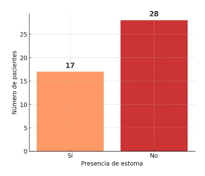 Con respecto a la Gráfica 3, reporta pacientes con obstrucción intestinal total que fueron llevados a un manejo quirúrgico, un 38 % de los casos resultaron con una ostomía producto de la cirugía.