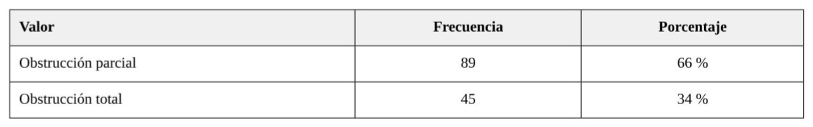En cuanto al manejo, se pudo documentar, según el compromiso, si la obstrucción era total o parcial, qué porcentaje de pacientes con obstrucción parcial respondieron a manejo médico y, del total de pacientes que fueron sometidos a una intervención quirúrgica, qué porcentaje de ellos acabaron con una ostomía producto de la cirugía.