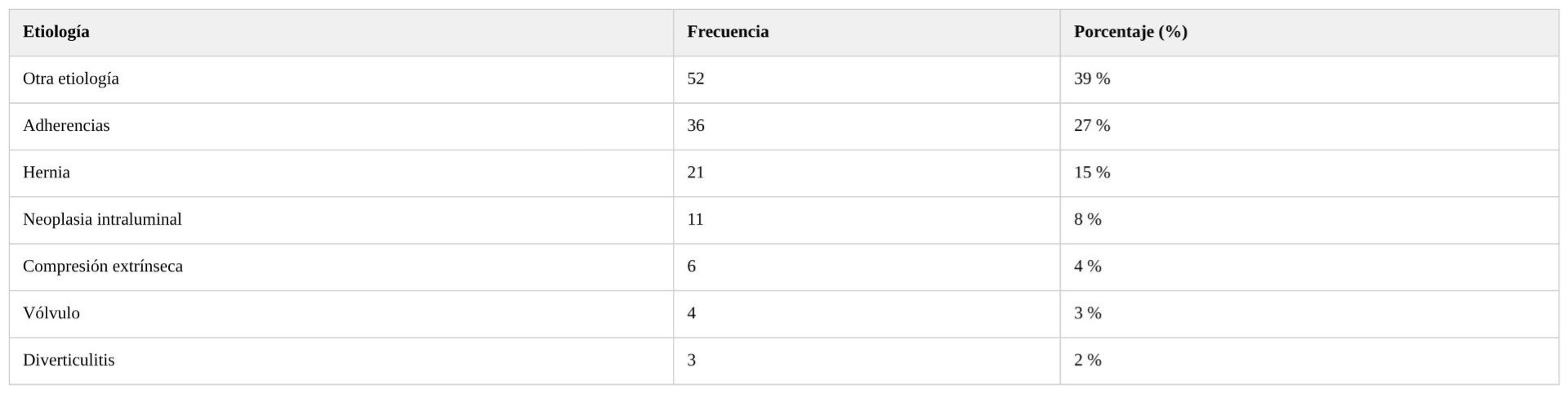 Las 3 principales causas de obstrucción intestinal en el estudio fueron adherencias, hernia y neoplasias intraluminales, con una frecuencia del 27 %, un 15 % y un 8 %, respectivamente. Un 39 % de los pacientes del estudio presentaron como causa de obstrucción intestinal una etiología que no estaba dentro de las opciones a estudiar (ver Tabla 2).