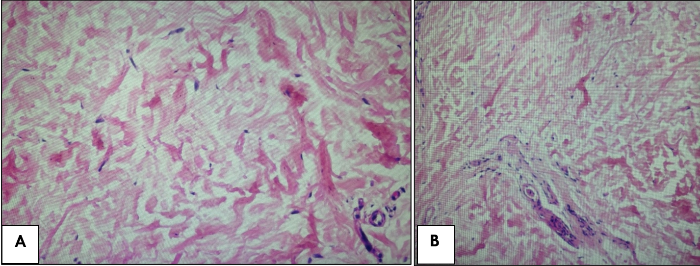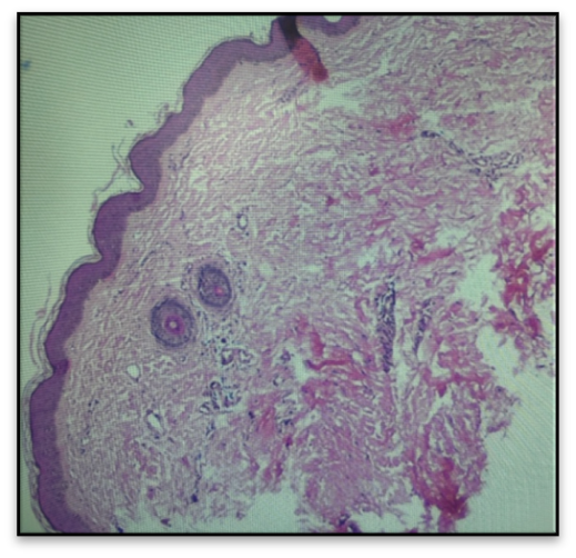 En ese contexto, se realizó una biopsia cutánea en la porción medial del miembro inferior izquierdo. El estudio histopatológico evidenció dermis esclerosada con engrosamiento de los haces de colágeno, hipocelularidad, disminución de anexos cutáneos y leve infiltrado linfoide, sin datos de actividad inflamatoria significativa, hallazgos compatibles con esclerodermia localizada profunda (morfea profunda) en fase crónica inactiva. (Figura 1 y 2)