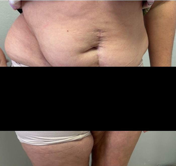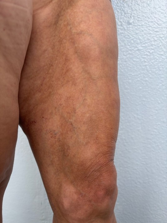 Al examen físico actual, se observa asimetría corporal y un estado de atrofia residual que compromete porción medial del miembro inferior izquierdo, desde el muslo hasta el tobillo, así como el hemiabdomen derecho. (Figura 3 y 4) La piel a nivel del muslo en región medial de la extremidad inferior izquierda presenta resequedad, telangiectasias residuales y pérdida del vello superficial. (Figura 5)