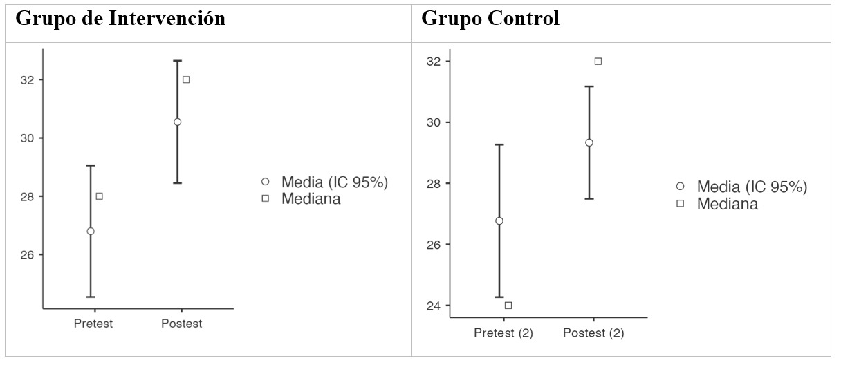 Ambos grupos presentan un promedio de pre test de 26.8 con una diferencia de dispersión de los datos de 7.3 puntos en el grupo de intervención y de 8 puntos en el grupo de control. En el post test hubo una variación de promedio, una diferencia con respecto al pre test de 3.8 puntos en el grupo de intervención y 2.5 puntos en el grupo de control.
