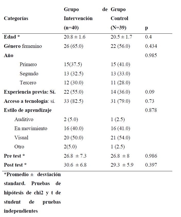 El 55 % (n=22) de los estudiantes del grupo de intervención refirieron experiencia previa con simulación y el 36.0 %(n=14) de los estudiantes del grupo control. El 82.5 % (n=33) de estudiantes del grupo de intervención y el 79.0 %(n=31) de los estudiantes del grupo control refirieron un acceso a la tecnología.