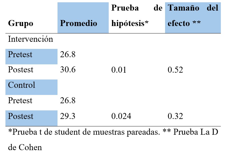 Al valorar el tamaño del efecto entre ambos grupos, se presenta un mayor efecto en el grupo de intervención que en el grupo control, 0.52, versus 0.32.