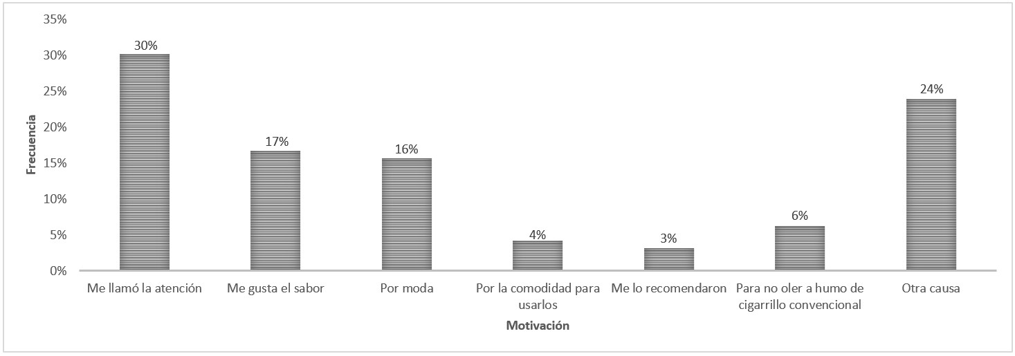 Otro aspecto importante que se obtuvo en respuesta múltiple fue que los estudiantes consumidores activos afirmaron que la motivación principal que los indujo a consumir el cigarrillo electrónico estuvo enmarcada en dos aspectos: “le llamó la atención”, con un 30 %, y un 24 % otra causa no declarada.