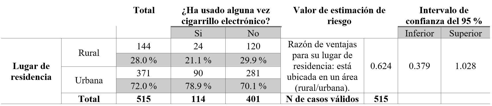 Por otro lado, al contrastar el lugar de residencia de los estudiantes versus alguna vez han probado el cigarrillo electrónico, el resultado fue de protección de riesgo; es decir, disminuye el riesgo de consumir cigarrillo electrónico si se proviene de un área rural. Con una estimación de riesgo rural/urbano de un 0.624 (0.379 – 1.028) con un intervalo de confianza de un 95 % (Tabla 2); sin embargo, el intervalo de confianza para la razón de ventajas incluye el valor 1, lo que implica que no se puede afirmar con certeza que esta diferencia sea significativa desde el punto de vista estadístico.