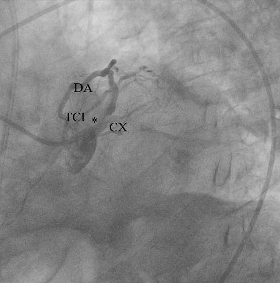 - Arteria circunfleja (CX): ocluída totalmente desde su ostium (flujo distal TIMI 0).