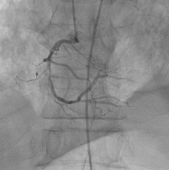 2. Arteria coronaria derecha: se observó una lesión en el segmento medio, excéntrica, con carga de trombo, con estenosis de 99% y flujo distal TIMI 2 (Ver Figura 3)