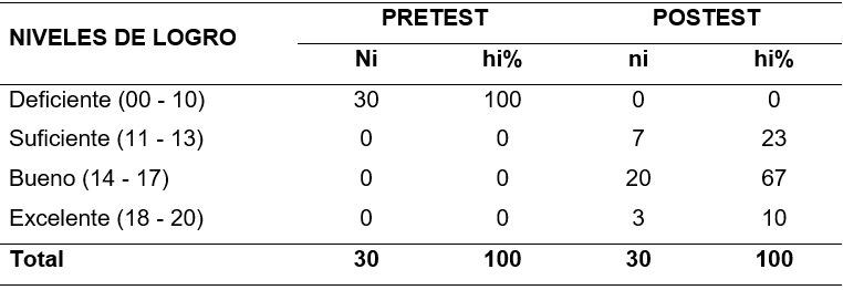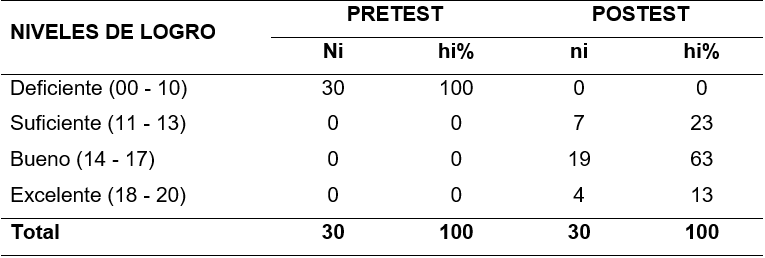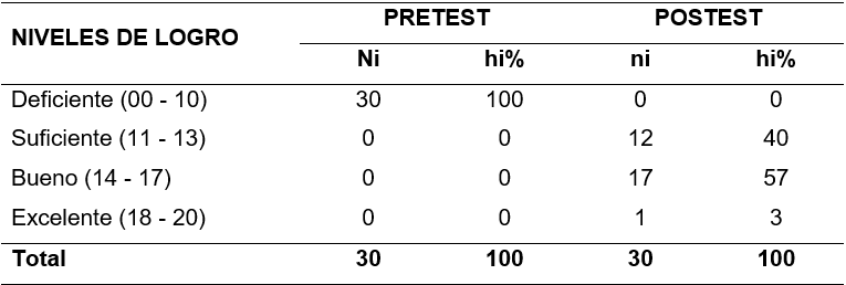 Nota.Data de la prueba pedagógica aplicada a la adquisición de conocimientos en el aprendizaje, donde ni representa la frecuencia absoluta y hi% indica la frecuencia relativa porcentual.