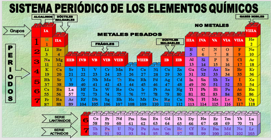 La tabla periódica de los elementos químicos es un sistema que organiza los elementos según su número atómico y sus propiedades. Se basa en la Ley Periódica, la cual establece la repetición sistemática de las propiedades físicas y químicas conforme aumenta el número atómico. Como herramienta fundamental en química, permite comprender las similitudes entre los elementos y predecir su comportamiento en diversas combinaciones. Los elementos se disponen en siete filas horizontales denominados períodos y dieciocho columnas verticales llamadas grupos, algunos de los cuales poseen nombres específicos, tales como calcógenos, halógenos y gases nobles. (Contreras, 2019 y Ayala, 2022)