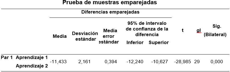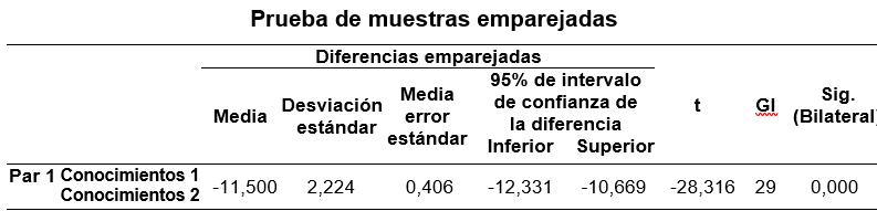 El instrumento fue evaluado por un panel de especialistas, quienes confirmaron su elevada validez de contenido (CVR = 0,903) y alta confiabilidad (α de Cronbach = 0,839). Para el análisis se recurrió a estadísticos descriptivos e inferenciales. Dado que la muestra era menor de 50 estudiantes, se aplicó la prueba de normalidad de Shapiro-Wilk, la cual verificó la distribución normal de los puntajes. Posteriormente, se empleó la prueba t de Student para muestras relacionadas, con un nivel de significancia de 0,05, a fin de contrastar la hipótesis planteada.