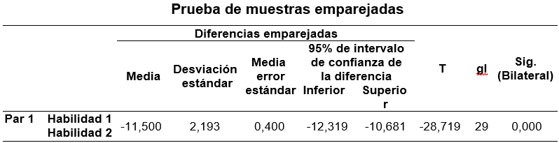 Prueba de T de Student de diferencia de medias sobre el desarrollo de habilidades en el aprendizaje significativo de la tabla periódica